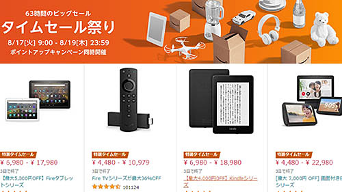 Amazonタブレット「Fire HD 8」が6,980円など、タイムセール祭りが実施中