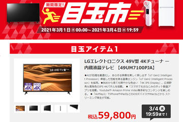 楽天ビックで「目玉市!」、LGの49型4K液晶テレビが59,800円