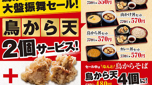 「鳥から天」が+2個! 小諸そばが「鳥から天大盤振舞セール!」を本日9日(木)から開催