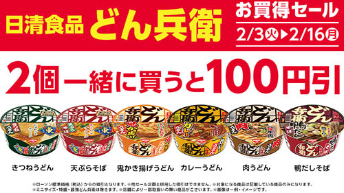 ローソンで「日清食品 どん兵衛」6種を2個同時購入で税込100円引!