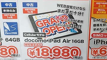 iPadOSに対応していないiPad Airがじゃんぱらで税込18,980円、セルラーモデルの中古品