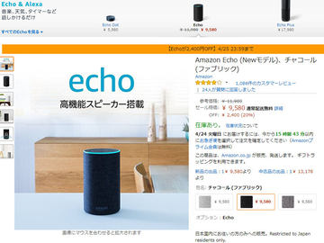 「Echo」が2,400円引きの9,580円に、「Amazonタイムセール祭り」4月25日まで