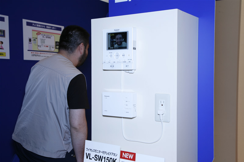 スタパがまず食いついたのは、「VIERA(ビエラ)」を見ながら来訪者を確認できる“どこでもドアホン”。「VIERA(ビエラ)」とドアホン用PLCアダプターを組み合わせることで、面倒な設置やむずかしい設定なしで利用できる。「VIERA(ビエラ)」でテレビ番組やビデオを楽しんでいる最中に来客があると、2画面表示に切り替わって来訪者が画面に映し出される。PLCなのでドアホンの親機とビエラを家庭内のコンセント経由で接続できるため、家の中をじゃまなケーブルがはい回る心配もない。というわけで、“どこでもドアホン”と「VIERA(ビエラ)」の連携には、がぜんのめり込むスタパだった。