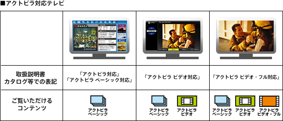 アクトビラ ビデオ・フル対応機種は、基本的にはアクトビラ ビデオとアクトビラ ベーシックには対応しており、アクトビラ ビデオ対応機種はアクトビラ ベーシックにも対応しているので、テレビの機能レベルという意味では「アクトビラ ベーシック < アクトビラ ビデオ < アクトビラ ビデオ・フル」という図式になっているようだ。