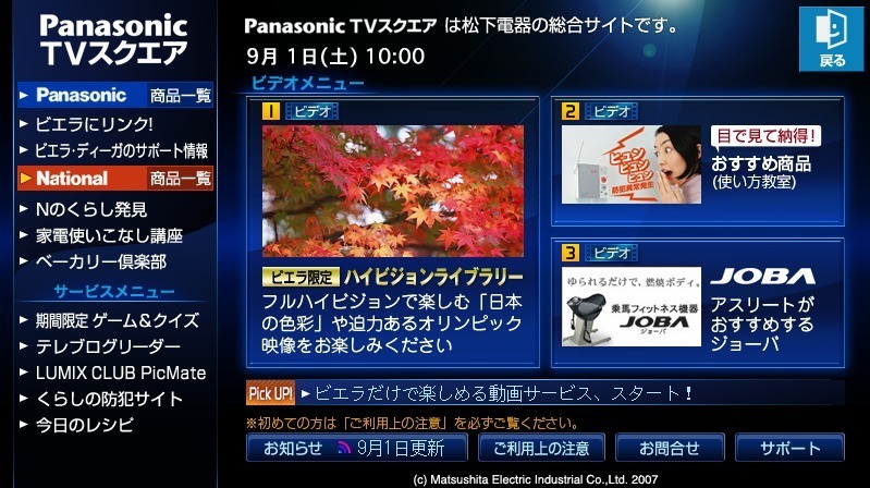 パナソニックはこれを「Panasonic TV スクエア」として展開しており、ここにビエラユーザー向けのオリジナルコンテンツを多数ラインナップしている。パナソニック担当者によれば、「かなり気合入っていますよ」とのことで、更新頻度もかなり高いようだ。