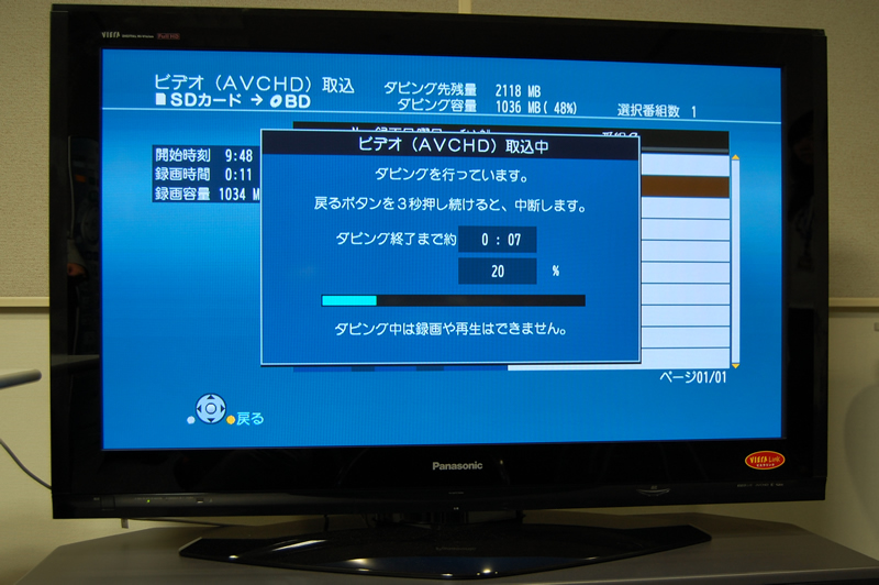 「ハイビジョンムービーを取り込み」を選ぶと、HDDへ取り込むか、BD/DVDへ取り込むかを選択する画面になる。ここではDVD-RAMにハイビジョンムービーを記録してみよう。DIGAにDVD-RAMをセットして決定ボタンを押すと、SDカード内の映像リストが表示される。あとはダビングしたい映像を選んで決定ボタンで、ダビングがスタートする。