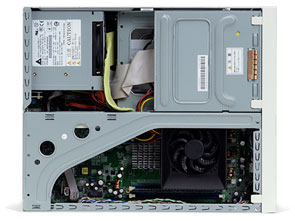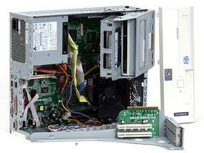 このサイズにしては拡張性は高めで、3.5inchのオーブンベイが1本、PCIの拡張スロットが2本用意されている。ただこのオープンベイ、HDDの増設は無理ではないが、むしろFDDや各種リムーバブル向けといった扱いなので、増設が必要ならUSB 2.0ポートないしIEEE1394カード経由なりで、外部に増設するほうが良いだろう。