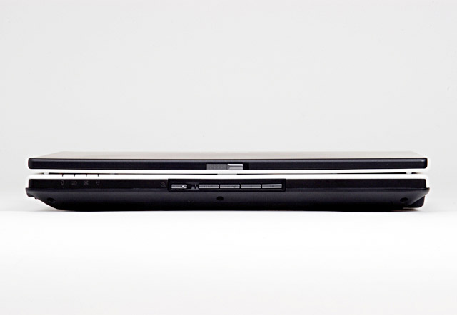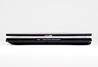 さすがにこれだけの機能を満載すると、サイズはちょっと大きめである。外形寸法は328mm×270mm×27~42mmで、いわゆるデスクノートサイズ。重量は標準バッテリ(リチウムイオンバッテリ2200)搭載時で3.3Kgとなっている。もっとも、ギガビットEthernetやMOBILITY RADEON 9700などを搭載するあたりを見れば、EDiCube FシリーズがターゲットとしているのはDTR(DeskTop Replacement)向けであることは明白。実際、そこらのデスクトップよりもよほどの高性能で、しかもコンパクトにまとまっているし、同種のDTR向けノートと比較しても、角をおとした洗練されたデザインのおかげでスマートに見える。自宅内で持ち運んで、自分の好きな所での使用などにはまったく問題はないだろう。