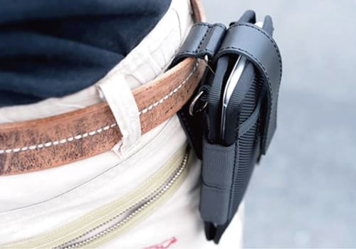 このケース、端末を入れて手で持っても、腰のベルトから吊しても、バッグインバッグ的にも、あるいはバッグやリュックのストラップなどに装着しても使えます。利用スタイルがマルチな感じ。