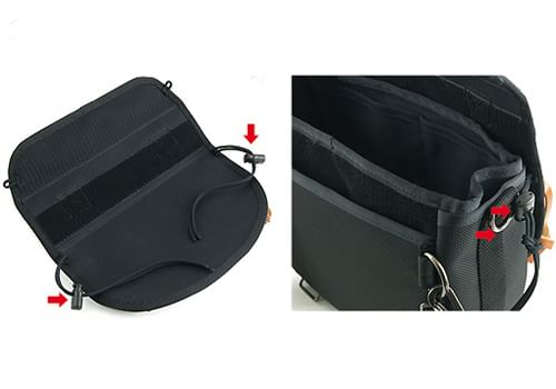 ちなみに、フラップとバッグ本体はベルクロ(面ファスナー)および化繊(ポリエステル)紐で留められています。縫い付けられていないので「フラップが不意に取れちゃわない?」とか思いがちですが、全然取れません。頑丈。逆にフラップ位置をかなり自由に変えられますので、ちょっと大きめのモノを入れたいという場合でも対応できたりして便利です。