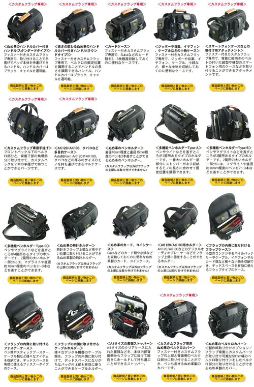 てな感じの「完全無欠のカスタムバッグ」シリーズ。便利ですヨ♪ そして「ここにスマートフォンケースを付けて、ここにペンホルダーを付けよう」とかカスタマイズすると便利度が上がるのはもちろん、ヒッジョーに楽しいです。