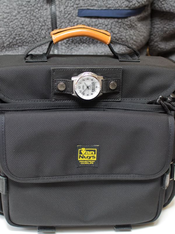 フラップ裏側には時計ホルダーを装着して時間がスグわかるぜ~。ちなみにハンドルは「長さの変わるぬめ革のハンドルカバー付きハンドル」だ