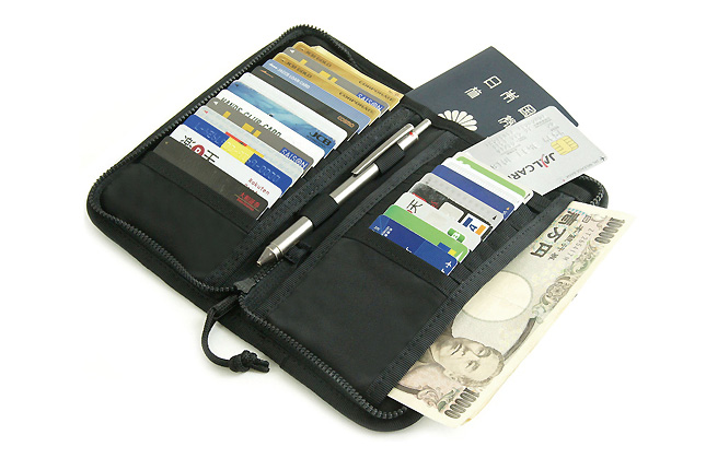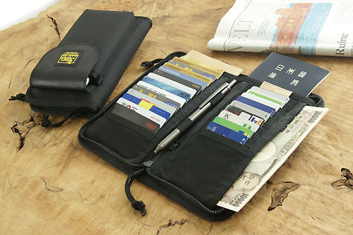 交通ICカードを入れるのに便利なポケットも装備もうひとつの「パスポートサイズウォレット」ですが、主に紙幣とカードを収納できるウォレットですな。カードはだいたい最大13枚(外側に1枚、内側に3枚×4箇所)、それに加えて紙幣なら20枚程度入るでしょうか。その程度までなら自然に折り畳めて分厚い感じはしません。そしてパスポートサイズなのでバッグにスッキリと収まります。