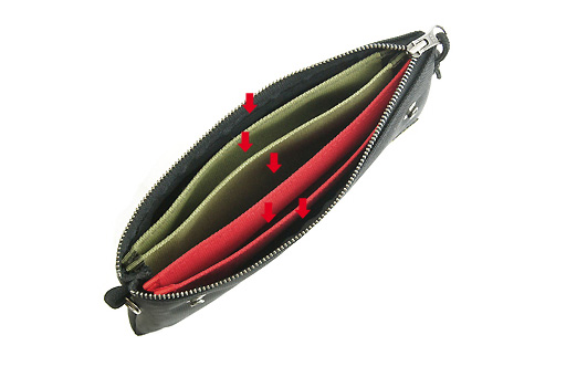 しかしこの「仕分けファスナーポーチ用仕分けポケット/仕切り」各種を使えば、カードや紙類、通帳、紙幣、さらにコインなどを、しっかり整理&分類しつつ収納できます。シークレットポケット機能なんかもあったりして。ちなみにカラーはオリーブとレッドが用意されています。