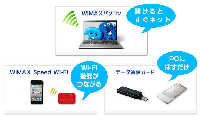 WiMAX接続をするための機器は大きく分けて3種類だが、契約形態などはすべて同じで、わかりやすい