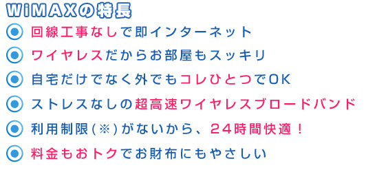 日本ではUQコミュニケーションズが、いちはやくこのサービスに取り組み、世界に牽引するビジネスを展開している。自宅はもちろん、外出先や移動中で下り最大40Mbps、上り最大10Mbps(※)の快適なインターネット接続環境が手に入る。しかも、利用帯域制限は無いため、24時間好きなときに大容量のデータを思うままにやりとりできる。(※)表記の通信速度はモバイルWiMAXシステム上の最大速度であり、実利用速度を示すものではありません。実際の通信速度は電波状況や回線の混雑状況、利用端末によって異なります。