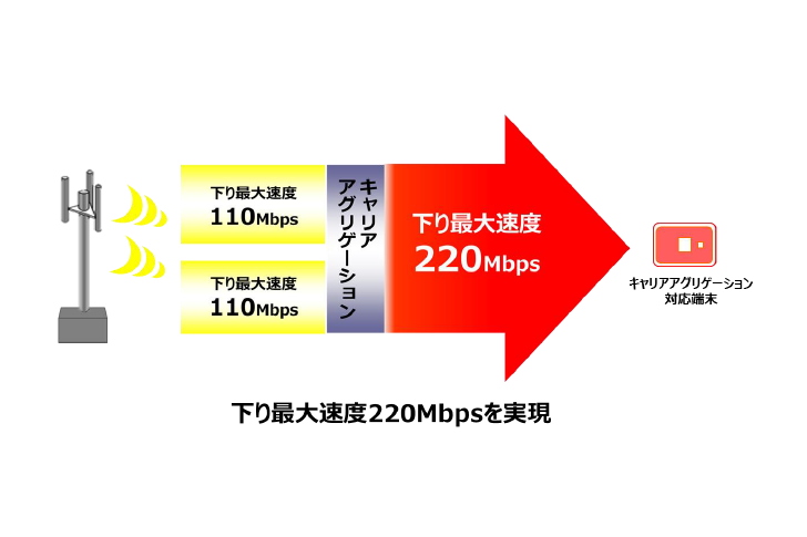 まずひとつめは、20MHz幅の電波をふたつ重ねて計40MHzの帯域幅を利用し下り220Mbpsにするキャリア・アグリゲーション(CA)という方法だ。