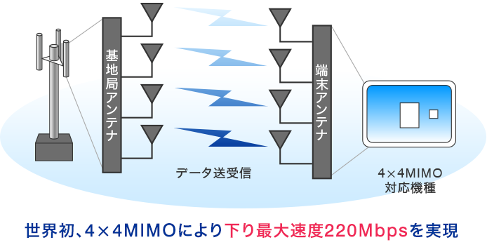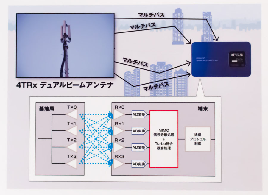 4×4 MIMOでは、それを4つまでやりとりできるようにする。電波の道が4つ作られ、ひとつの周波数帯域で4倍の効率が得られるのだ。WiMAX 2+でいえば、シングル通信だと55Mbpsのところを2×2 MIMOで2倍の110Mpbsになっていたが、今回4×4 MIMOでさらに2倍になり、結果としてシングル通信の4倍の220Mpbsとなるわけだ。