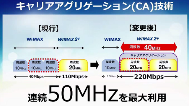「WiMAXで使っていた30MHz帯のうち20MHz帯をWiMAX 2+に割り当てることによって、CAを実現します。一方で、10MHz帯になったWiMAX通信は下り最大13.3Mbpsまで通信速度が下がります。だから、今WiMAXをご利用中のお客様には、現在実施中の「史上最大のタダ替え大作戦」をご利用していただき、できるだけ早期にWiMAX 2+サービスに移行していただきたいと考えています。