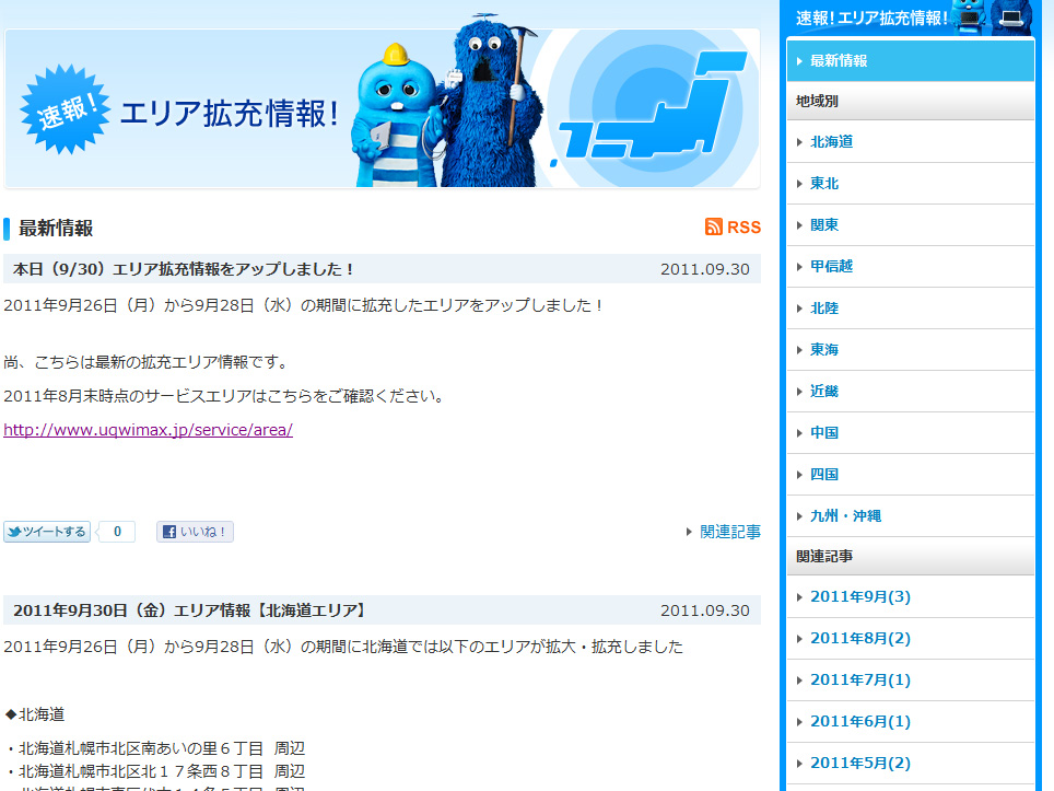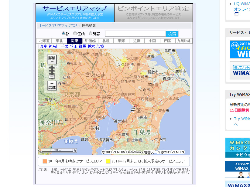 UQ WiMAXサイトのエリアマップでは、現在カバーされているエリアと、今後カバーされる予定のエリアを把握できる(左)。また、エリア拡充情報ページには毎月、新たに設置された基地局の情報を知ることができる(右)。