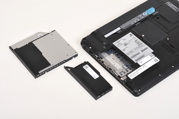 ― 薄型軽量化にもかかわらず、従来のマルチベイ構造がそのまま踏襲されています。光学ドライブを取り外してダミーカバーをつけて軽量化したり、追加のバッテリーを入れたり、プロジェクタを内蔵したりと、実にフレキシブルに対応できるのは便利です。