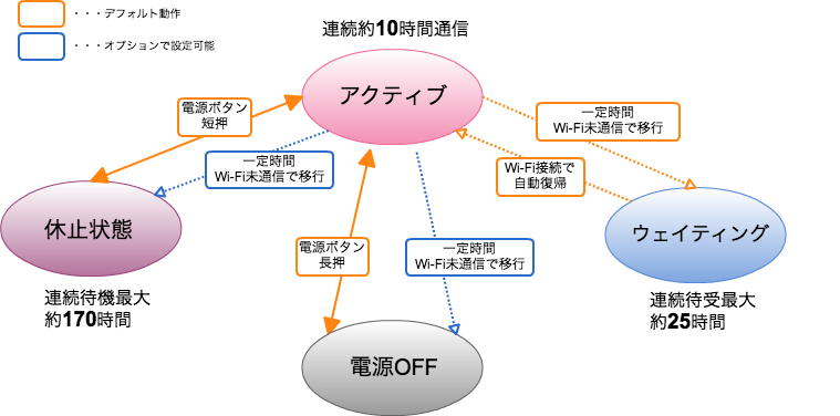 小笠原ウェイティング状態とは、Wi-Fiだけが起きていてその他のシステムは寝ている状態で、PCなどのWi-Fi子機が接続されると、本体が眠りから覚めてWiMAX側の通信を再開する仕組みです。初期値では10分間Wi-Fi通信が途絶えると自動的にウェイティングに移行し、再びWi-Fi機器が接続されると数秒で復帰しますので、待たされる感じはほとんどないかと思います。