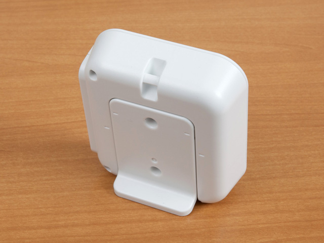 そこで、部屋に据え付けたときの見かけや設置のしやすさ、自由度などを十分に考慮しました。このように斜めに立つところなどは、ちょっとコンパクトでおしゃれでしょう。今回は、女性のデザイナーに参加してもらって、特にフェミニンなイメージに仕上げました。リビングなどの見えるところに置いてあっても違和感なくインテリアに溶け込みます。もちろん壁掛けも可能になっています。壁掛けパーツはフック式になっているので、普段は壁掛けしていて、一時的に別の部屋に持ち出すといったことも可能です。