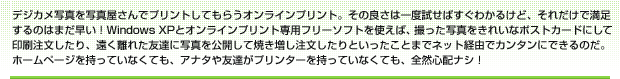 デジカメプリント機能は、Windows XPからのオンラインプリントと同じように、デジカメでアナタが撮り貯めた画像ファイルから、プリントしたい画像だけを選んでインターネット経由でプリント注文できるというもの。