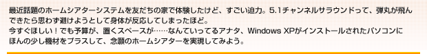 次にWindows Media 9(Windows XP版)で初めて対応した5.1chサラウンドサウンドを試してみた。使用したのはマイクロソフト社がPC量販店などで期間限定で配布した、「デジタル・エブリデイWindows XPスタイルブック」に付属しているコンテンツCDだ。