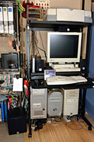 | ▲パソコンデスクの背後が扉のため、あえなくこのレイアウトに。左リアは専用スタンドを使用。 |