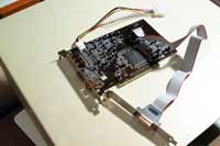 | ▲Audigy 2 Platinum eX カードとジョイスティック/MIDI用ブラケット。カードの左上に繋がっているのは電源ケーブル。 |