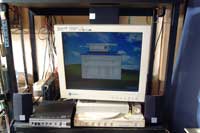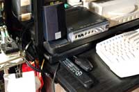 | ▲豊富なインターフェイスを搭載する”ブレイクアウトボックス”はディスプレイの脇に横にして設置した。キーボードの横にあるのが、ワイヤレスリモコンと、Inspire