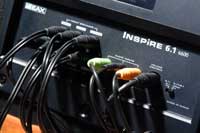 スピーカーの接続法だが、まずサブウーファーと Audigy 2 Platinum eX カードの背面ポートを 3 プラグステレオミニプラグケーブルで接続し、6台のサテライトスピーカーをサブウーファーに繋ぐ。あとは電源ケーブルと、ワイヤードボリュームコントローラーを接続すれば完了。至って簡単だ。各スピーカーの配置だが、フロントとサブウーファーは前回と同位置だが、リアスピーカーが3台になったので、今回は専用スタンドを使って、それぞれを置くことにした。